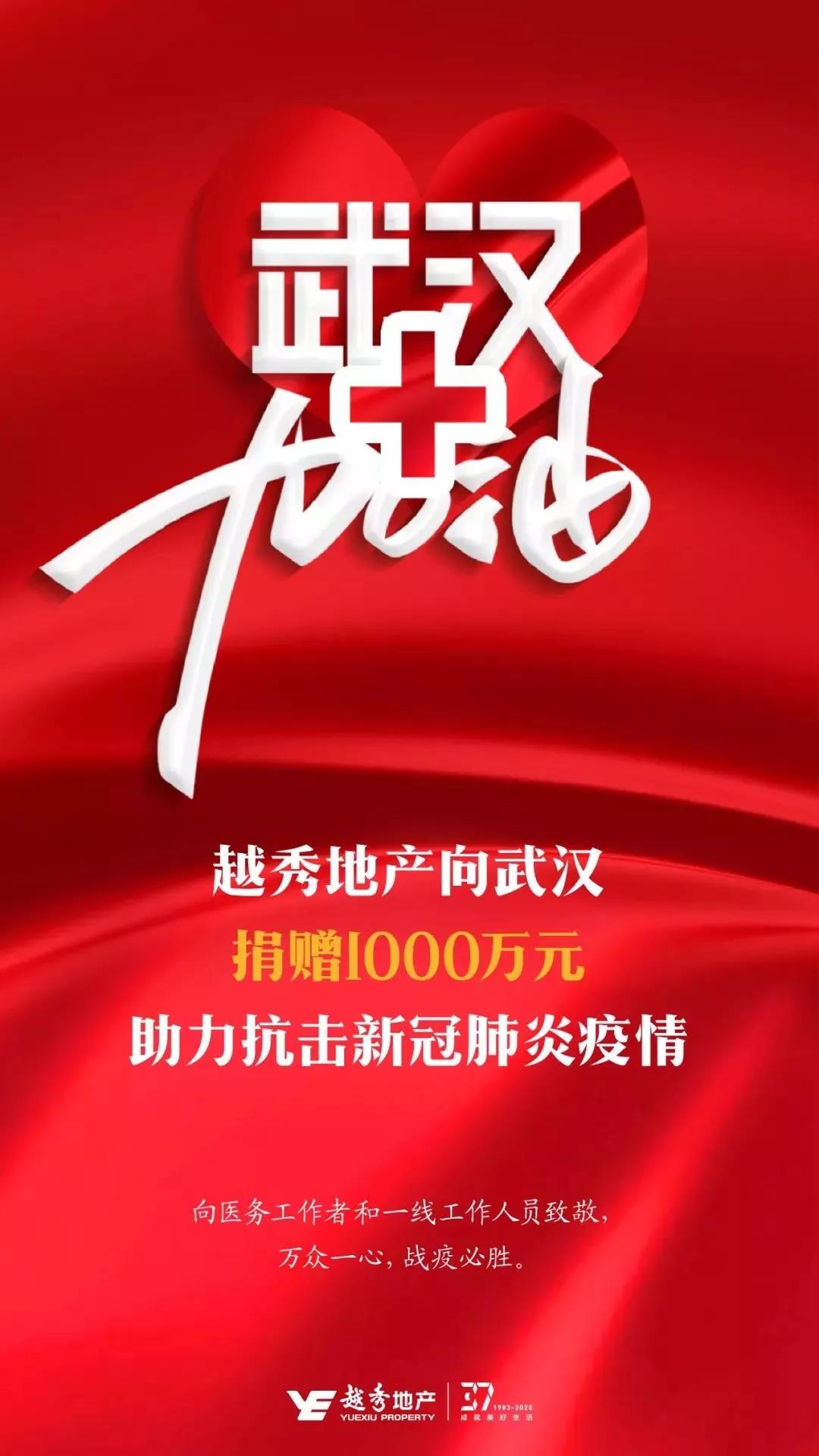 1月30日,越秀地产向武汉市红十字会捐助1000万元,帮助武汉抗击新型冠状病毒感染肺炎疫情。该笔捐款将用于支援武汉地区疫情防控工作,采购短缺医疗设备和物资,支援一线医护人员,为当地人民群众的安全和健康贡献一份力量。