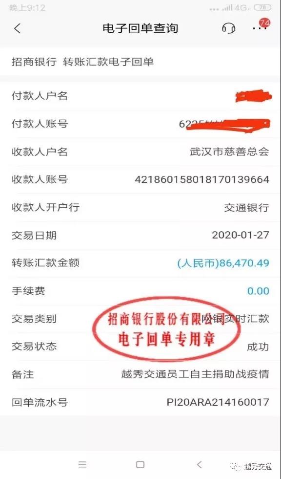 1月27日,越秀交通汉孝公司将越秀交通近200名员工爱心捐赠的近9万元捐献至武汉市慈善总会账号。一方有难、八方支援,越秀交通第一时间发出倡议、号召同事们爱心捐赠,迅速得到员工们的群起响应。
