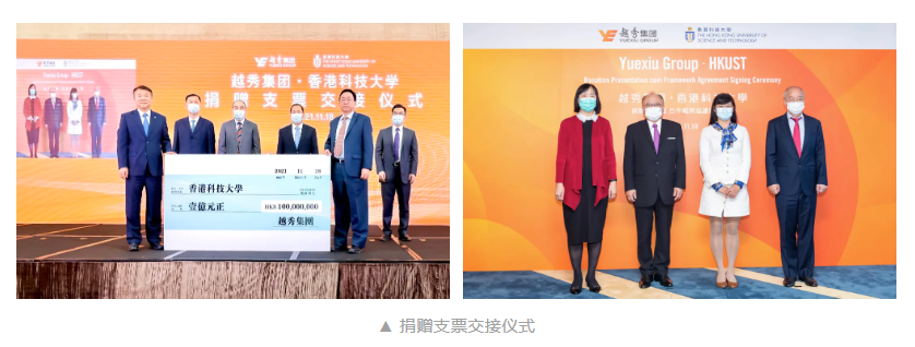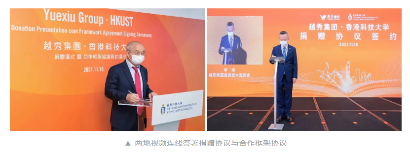 11月18日,越秀集团与香港科技大学捐赠仪式暨合作框架协议签约仪式在广州以“云签约”形式举行。香港中联办、香港特区政府、广州市、南沙区、越秀集团、香港科技大学有关领导和嘉宾出席活动。活动现场,越秀集团与香港科技大学先后签署了捐赠协议和合作框架协议。